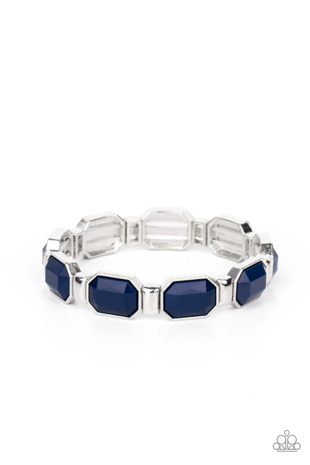 Encased in sleek silver fittings, faceted blue beads join dainty silver rectangular frames along stretchy bands around the wrist for a dainty pop of color.