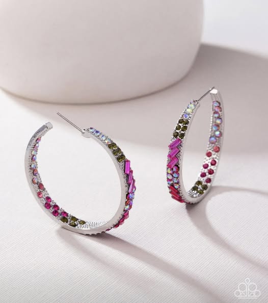 The front facing surface of a chunky shiny silver hoop is dipped in brilliantly sparkling iridescent, pink, green and white rhinestones while light-catching texture wraps around the back. The interior of the hoop features the opposite pattern, creating the illusion of a full hoop of blinding rhinestones. Earring attaches to a standard post fitting. Hoop measures 1 3/4" in diameter. Due to its prismatic palette, color may vary.