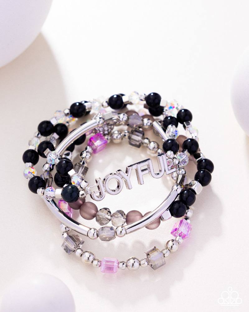 Infused along elastic stretchy bands, a collection of silver beads in varying cuts and shapes joins a white rhinestone-embellished accent, glossy black beads, transparent beads, pink transparent cubes, smoky transparent beads in varying cuts, gray milky beads, and silver letters which spell out the word "JOYFUL" for a sentimental, inspiring display. Sold as one set of four bracelets. This Empire Diamond Exclusive was designed by 2024 Life of the Party member with Empire Diamond Access, Kristen I.