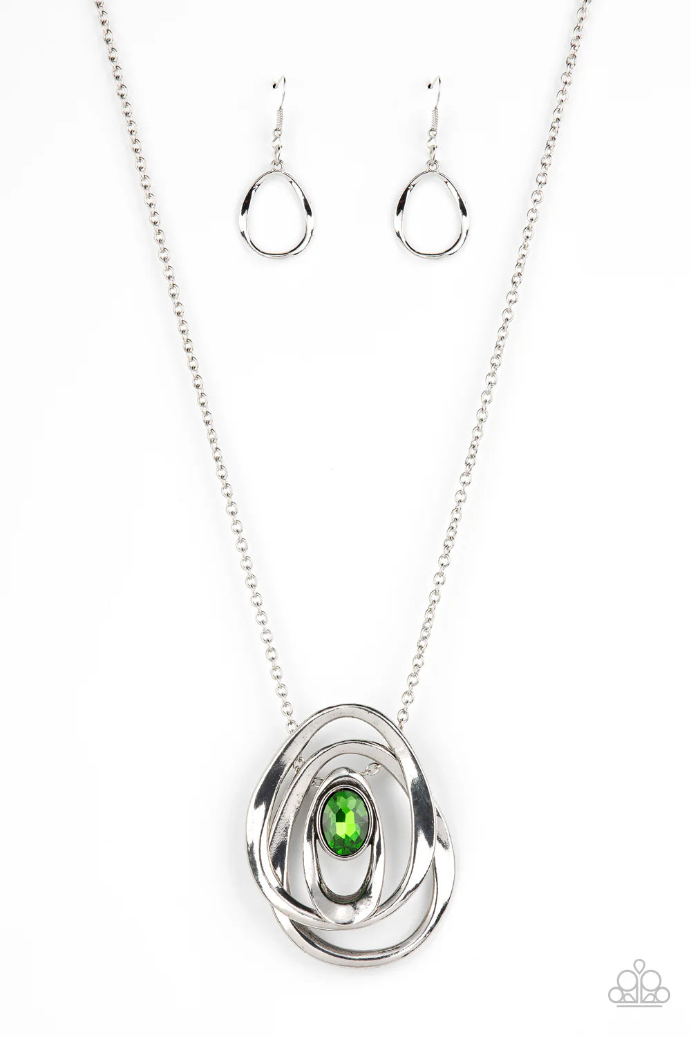 An oversized glittery green gem seemingly floats inside an asymmetrical silver oval that glides between two oversized silver ovals at the bottom of an extended silver chain, creating an edgy pendant. Features an adjustable clasp closure.