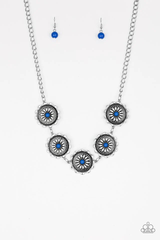 Infused with bright blue beaded centers, ornate floral stamped frames link below the collar for a colorfully, seasonal look. Features an adjustable clasp closure. Sold as one individual necklace. Includes one pair of matching earrings.