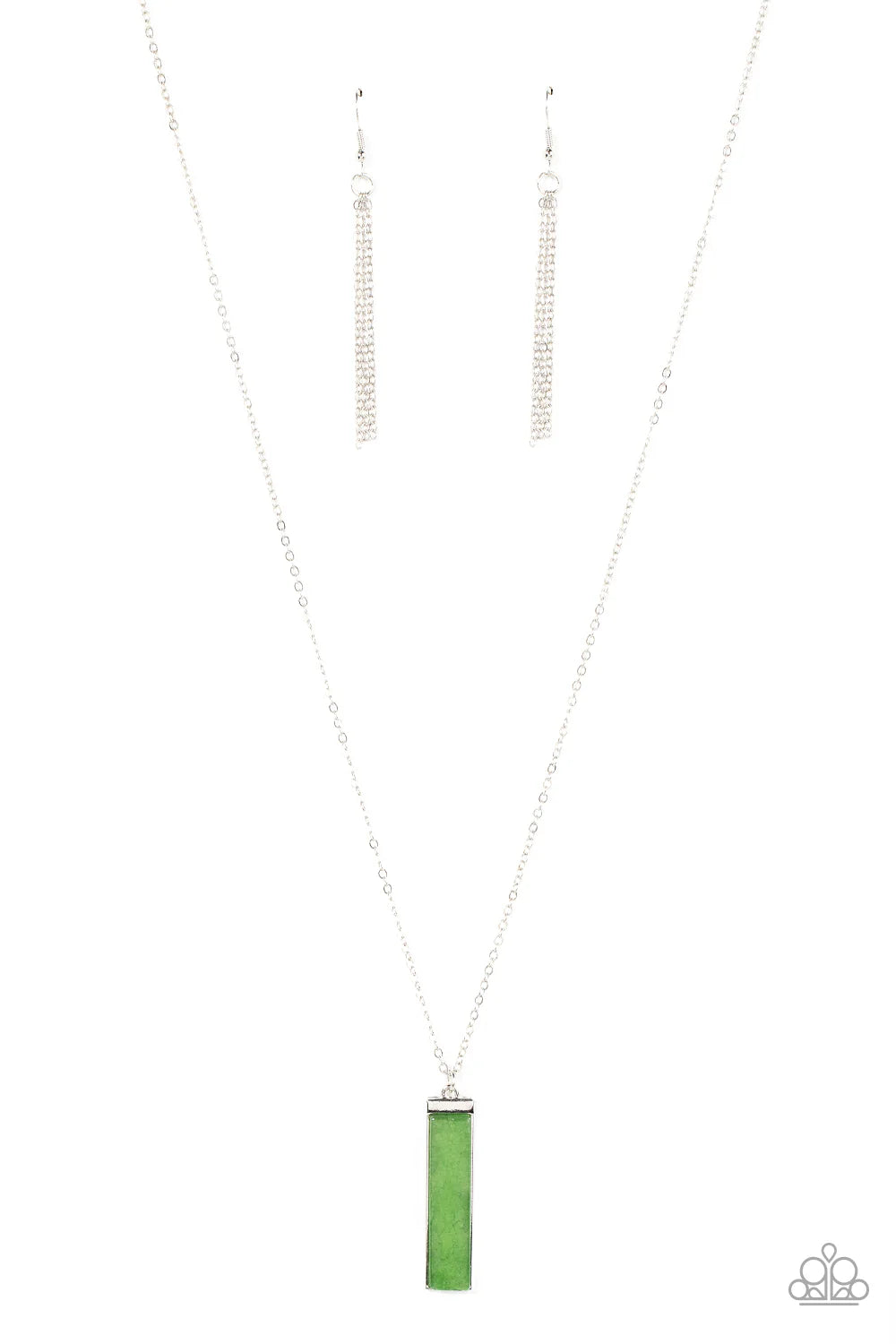 A rectangular cut jade stone is pressed into the center of a shiny silver frame at the bottom of an extended silver chain, resulting in an earthy pendant. Features an adjustable clasp closure.