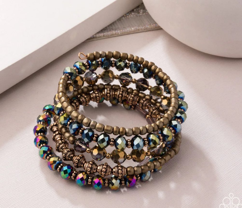 Threaded along a coiled wire, a collection of textured UV shimmery midnight beads, brass seed beads, beehive-textured UV shimmery transparent beads, antiqued gold studs, oil spill faceted beads, milky gray cylindrical beads, and floral gold beads collect and stack along the wrist for a brilliantly bold infinity wrap-style bracelet. Sold as one individual bracelet.