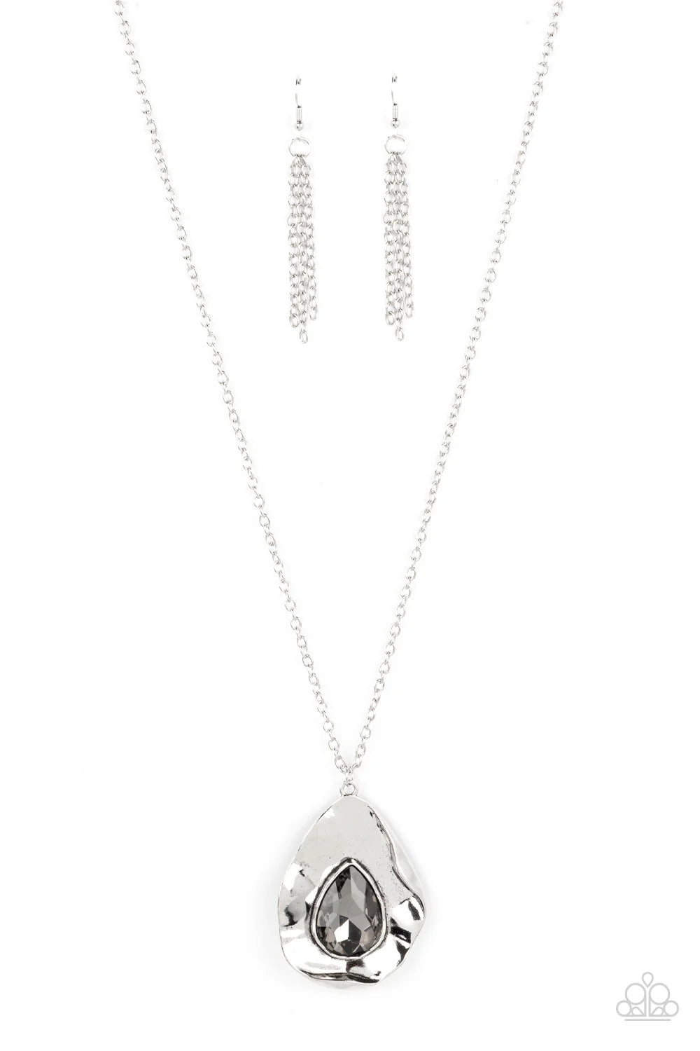 A warped silver frame gently folds around an oversized smoky teardrop gem center, resulting in a gritty yet glamorous pendant at the bottom of a lengthened silver chain. Features an adjustable clasp closure.