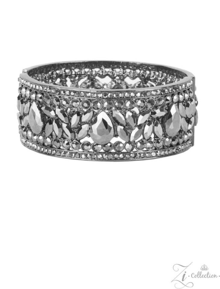 A smoldering collection of oversized teardrop and marquise cut hematite rhinestones daringly fan out from the collar, coalescing into intense interconnected frames. The dauntless display of dazzle locks in place, creating a stunning solitaire sparkle. Features an adjustable clasp closure.